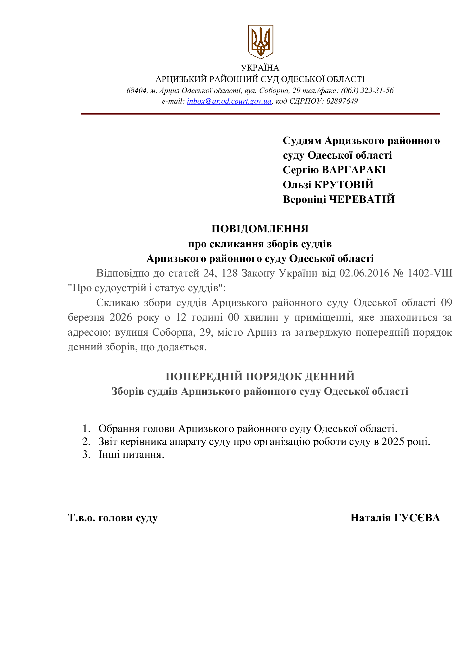 Призначено збори суддів Арцизького районного суду Одеської області