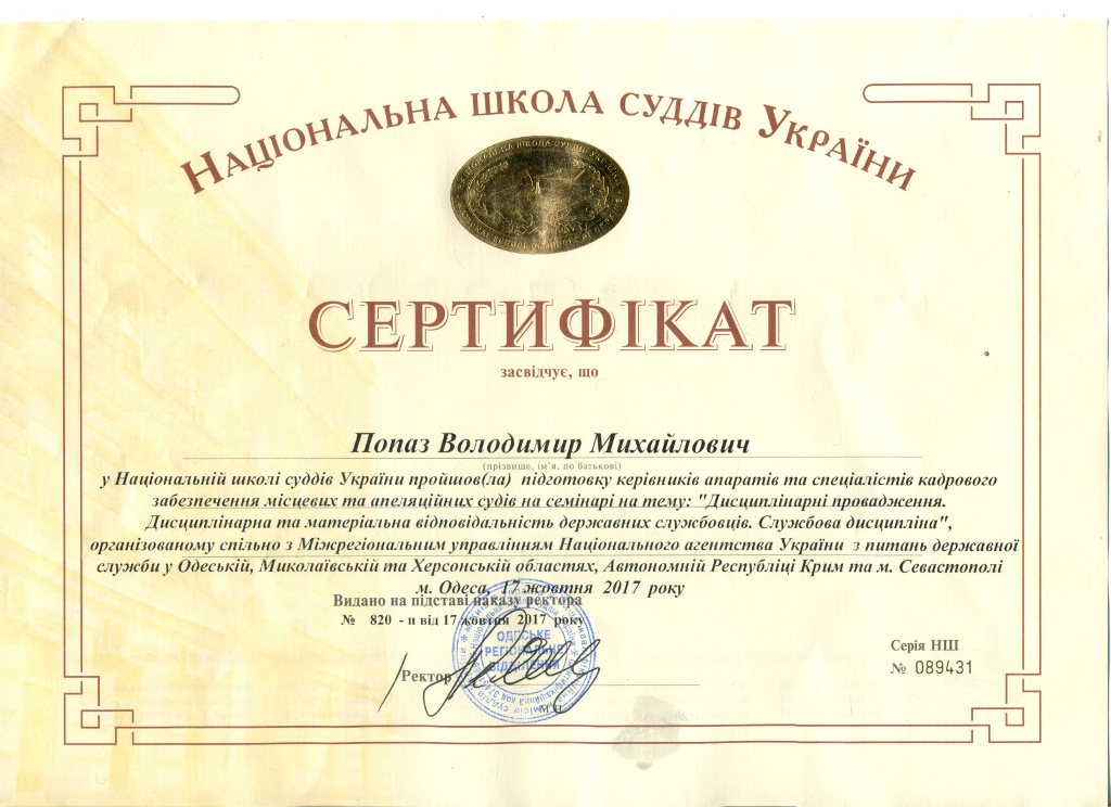 17 жовтня 2017 року керівник апарату Арцизького районного суду Одеської області Попаз Володимир Михайлович прийняв участь у семінарі на тему: «Дисциплінарні провадження. Дисциплінарна та матеріальна відповідальність державних службовців. Службова дисципліна» та отримав сертифікат. Захід був проведений Національною школою суддів України спільно з Міжрегіональним управлінням Національного агентства України з питань державної служби у Одеській, Миколаївській та Херсонській областях, Автономної Республіці Крим та м. Севастополі для керівників апаратів та спеціалістів кадрового забезпечення місцевих та апеляційних судів.