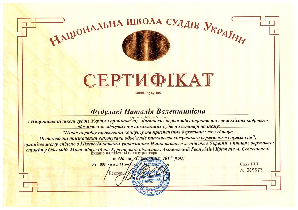 31 жовтня 2017 року заступник керівника апарату Арцизького районного суду Одеської області Фудулакі Наталія Валентинівна прийняла участь у семінарі на тему: «Щодо порядку проведення конкурсу та призначення державних службовців. Особливості призначення виконувача обов’язків тимчасово відсутнього державного службовця» та отримала сертифікат. Захід був проведений Національною школою суддів України спільно з Міжрегіональним управлінням Національного агентства України з питань державної служби у Одеській, Миколаївській та Херсонській областях, Автономної Республіці Крим та м. Севастополі для керівників апаратів та спеціалістів кадрового забезпечення місцевих та апеляційних судів.