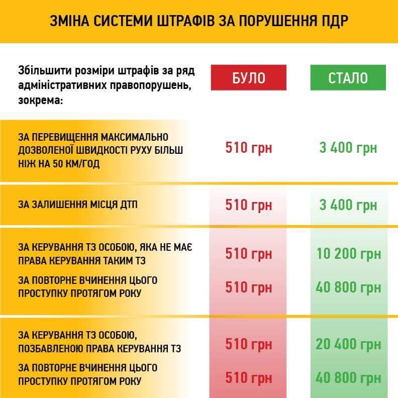 З 27 вересня 2018 року збільшено штрафи за перевищення швидкості, за залишення правопорушником місця ДТП. Крім того, водія можуть позбавити права керувати транспортним засобом терміном до шести місяців. Також, зростуть штрафи за неправильну паркову. В березні Президент України Петро Порошенко підписав закон, який узаконив фото та відео фіксацію порушень. Інспектори зможуть штрафувати водіїв заочно. Сповіщення надходитимуть правопорушникам у вигляді СМС-повідомлень або квитанцій на лобовому склі. В різних випадках за незаконну паркову прийдеться заплатити від 255 до 1700 грн.
