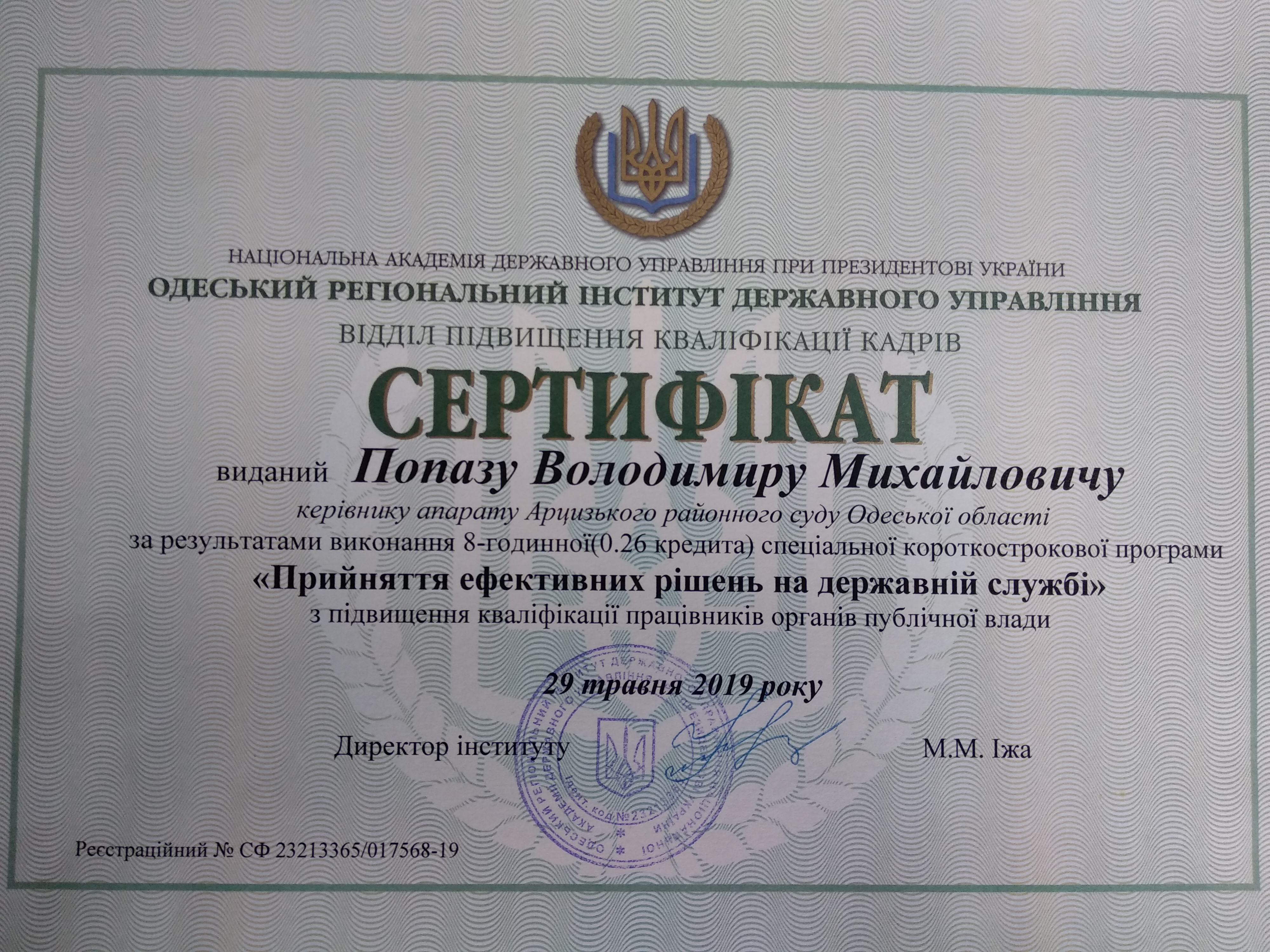 29 травня 2019 року у Одеському регіональному інституті державного управління Національної академії державного управління при Президентові України була проведена спеціальна короткострокова програма «Прийняття ефективних рішень на державній службі». У зазначеному заході взяв участь керівник апарату Арцизького районного суду Одеської області Володимир Попаз. У рамках програми слухачі розглянули актуальні питання професійної компетентності державних службовців як умови ефективної діяльності органів державної влади публічного управління, декларування доходів посадових осіб місцевого самоврядування як засіб попередження корупції, профілактика емоційного вигорання, досвід зарубіжних країн у здійсненні заходів щодо боротьби з корупцією і його імплементації у національне законодавство, роль ГРЕКО у захисті прав людини в боротьбі з корупцією.